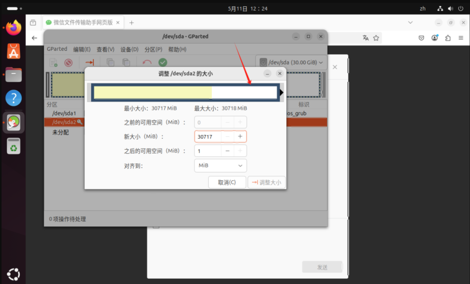 2.下载Gparted sudo apt-get install gparted,打开,选择需要扩充的盘